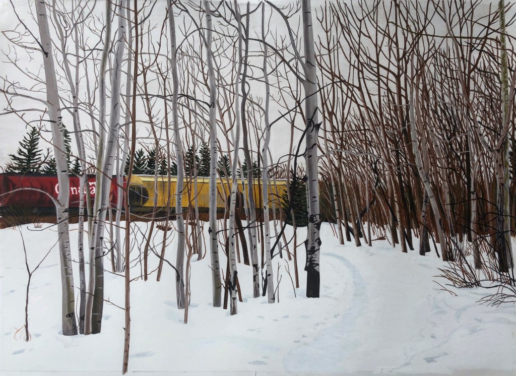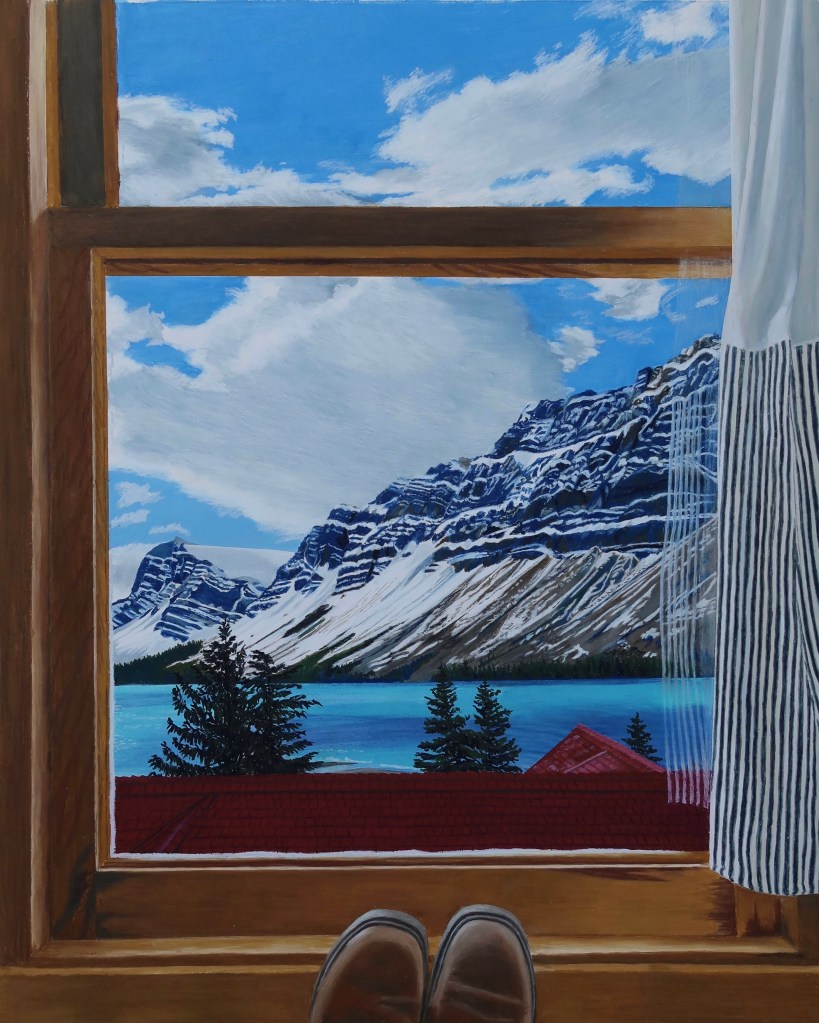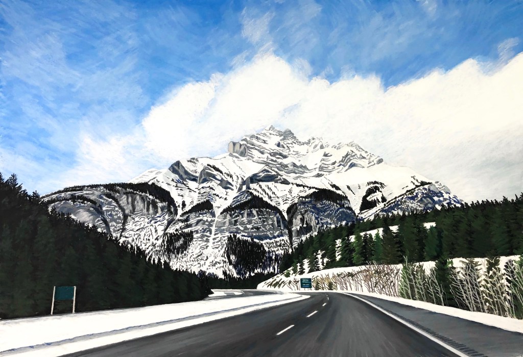 Walking along the railway line, Edworthy Park. (sold)Little Elbow River, on a cold day in June (sold)Road trip 2020. 73 x 50cmView of Bow Lake from Num-Ti-Jah Lodge. 53 x 66cmWildcat Road view. Cascade Mountain, on the road to Banff. 73 x 51cmLake Louise, spring melt. 71 x 53cm